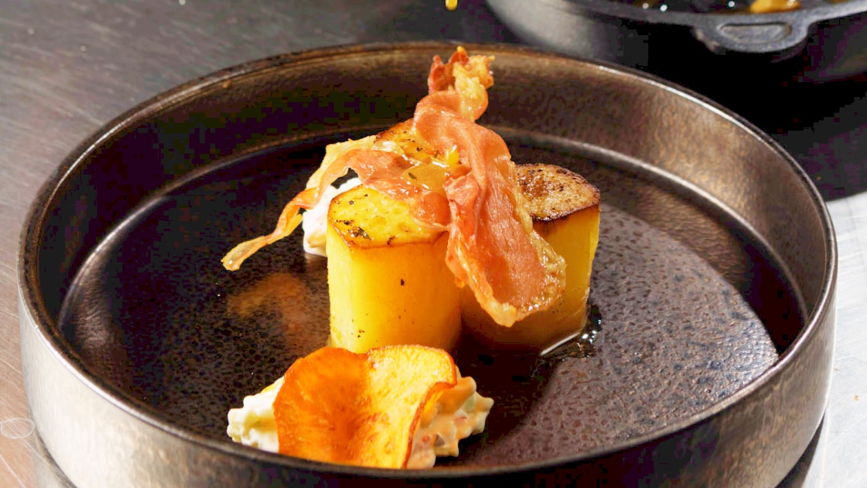 Kurczak z musem grzybowo-szpinakowym/ purée z batata/ ragoût z nogi kurczaka w panko/ babeczka z surówką marchewkową/ zero waste/ sos oliwa ziołowa